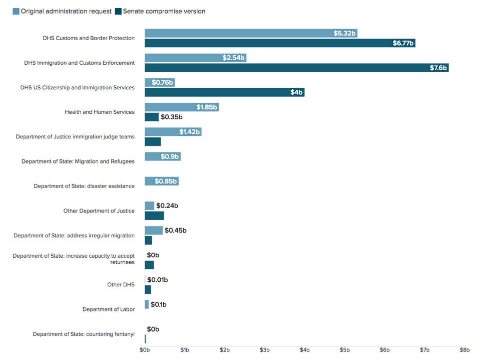 Legislators spent more than ten weeks in late 2023 negotiating the details of a bipartisan bill in the Senate which was the first serious effort in more than a decade to combine policy changes and resources required to improve the situation at the border. The bipartisan Senate deal offered more money for border and immigration security ($20.3 billion) than the Biden administration had requested ($13.6 billion). There were also major shifts in the bipartisan bill with regard to how the money was allocated. See the graph below for details.